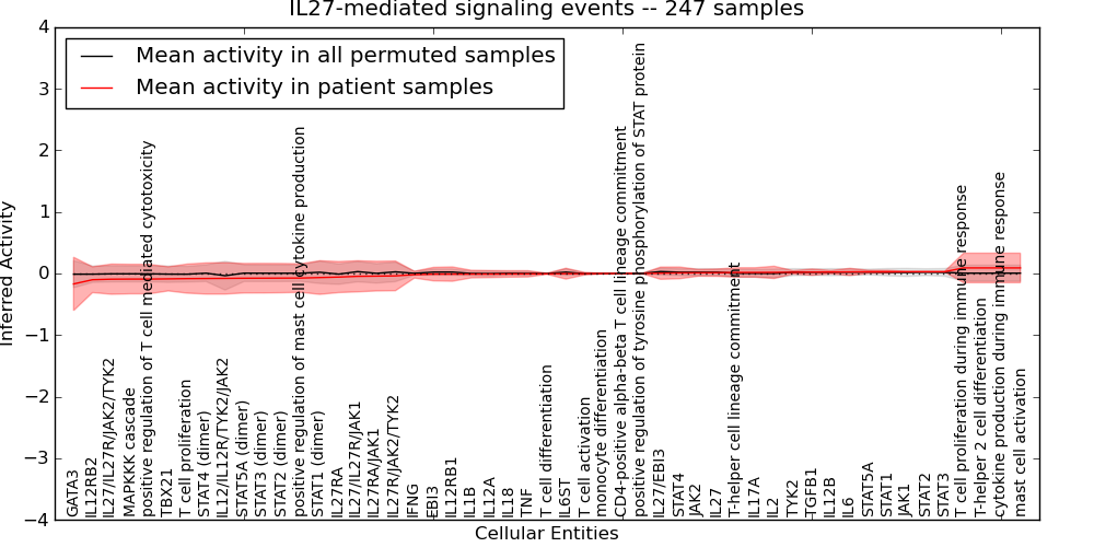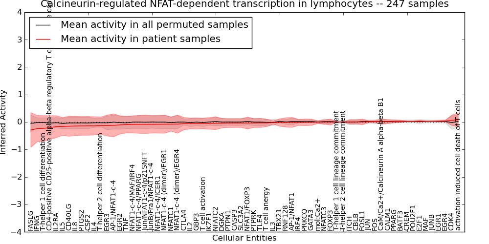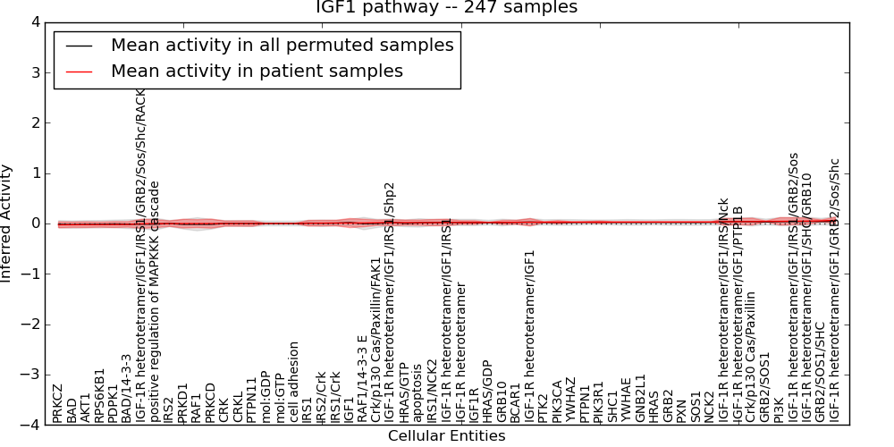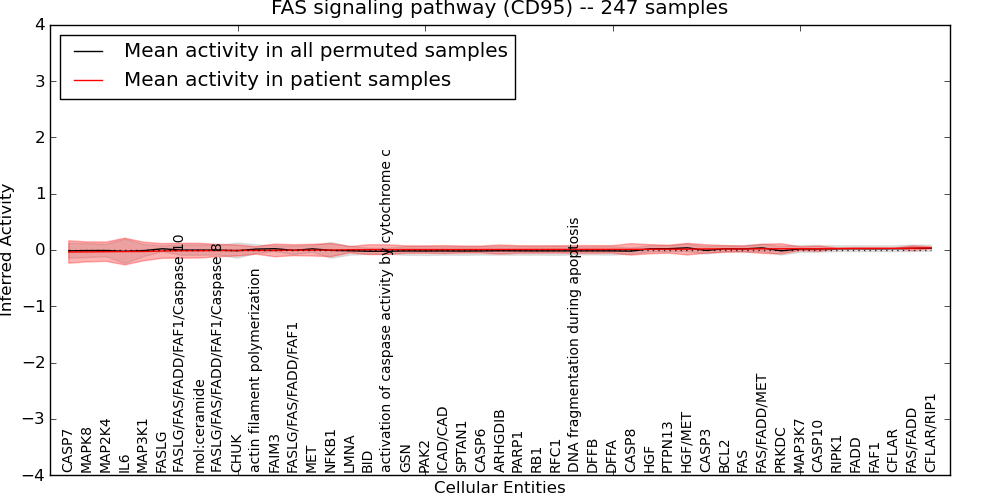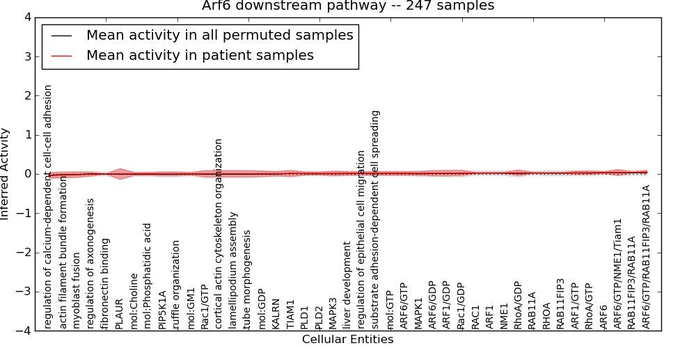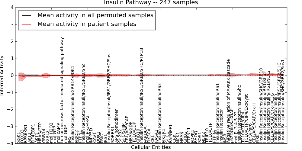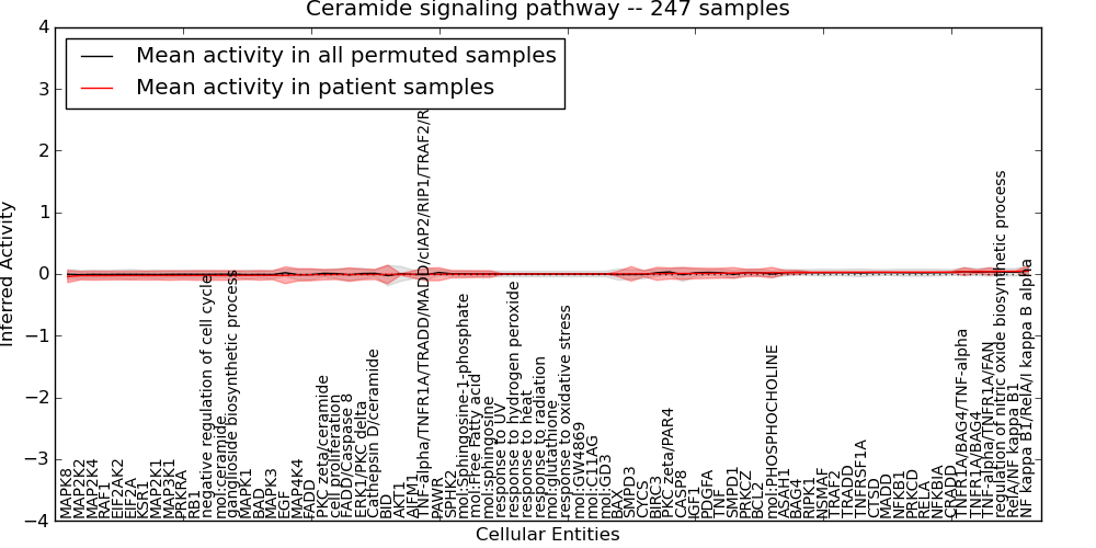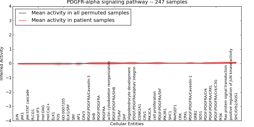 Figure S131. Get High-res Image This plot shows pathway concept perturbations across all samples against a permutation model. The concepts along the x-axis are sorted by lowest to highest mean activity for the real patient samples. Mean inferred activities are plotted along the y-axis as a colored band showing the average level and one standard deviation range. Real samples are shown in red and permuted samples in black.