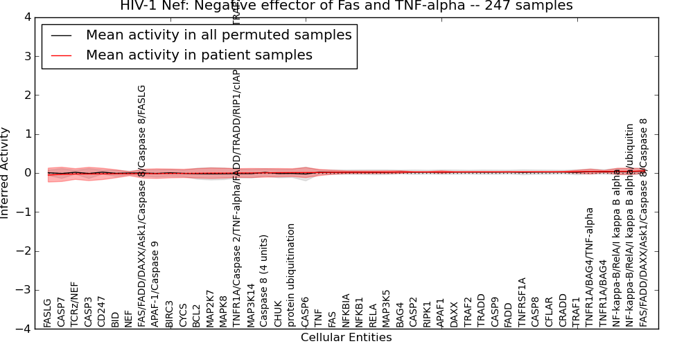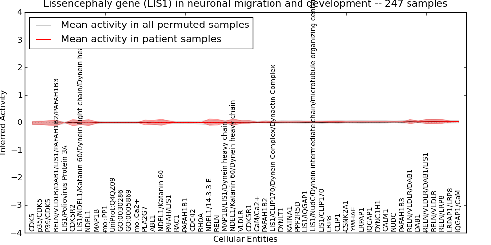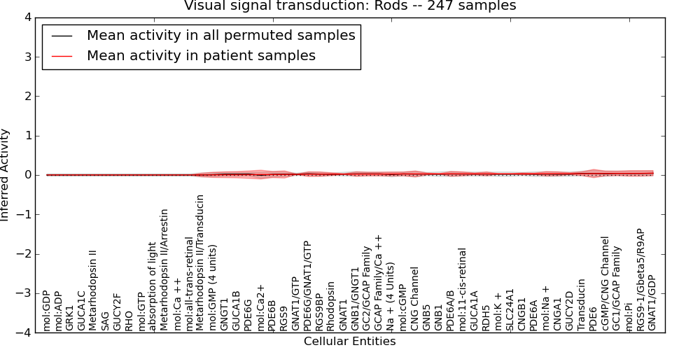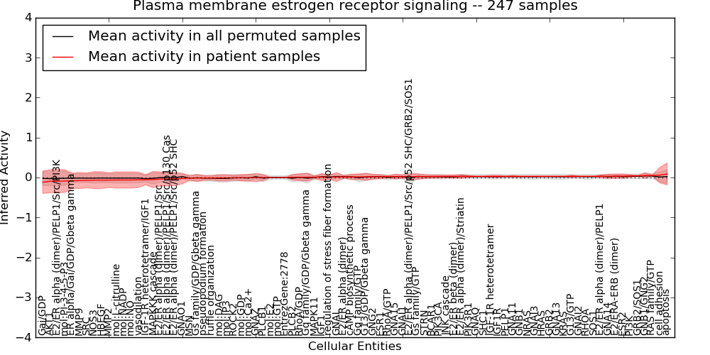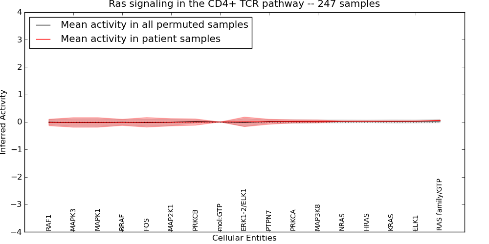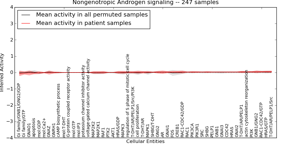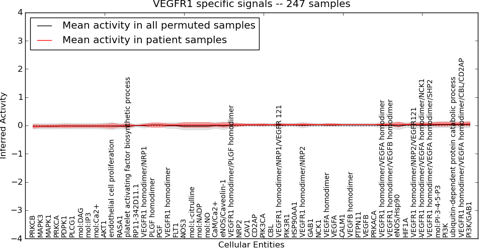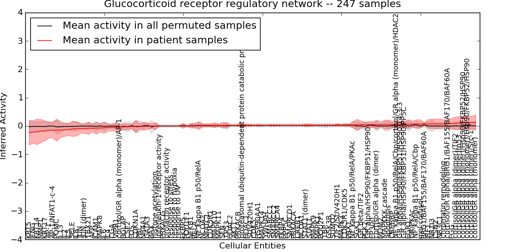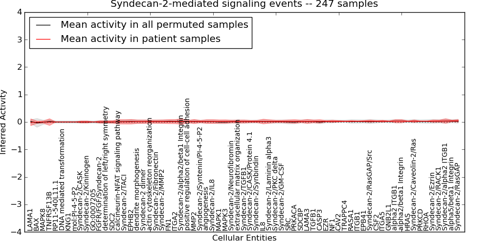 Figure S131. Get High-res Image This plot shows pathway concept perturbations across all samples against a permutation model. The concepts along the x-axis are sorted by lowest to highest mean activity for the real patient samples. Mean inferred activities are plotted along the y-axis as a colored band showing the average level and one standard deviation range. Real samples are shown in red and permuted samples in black.