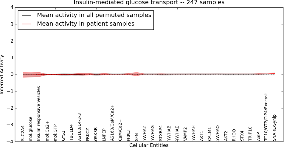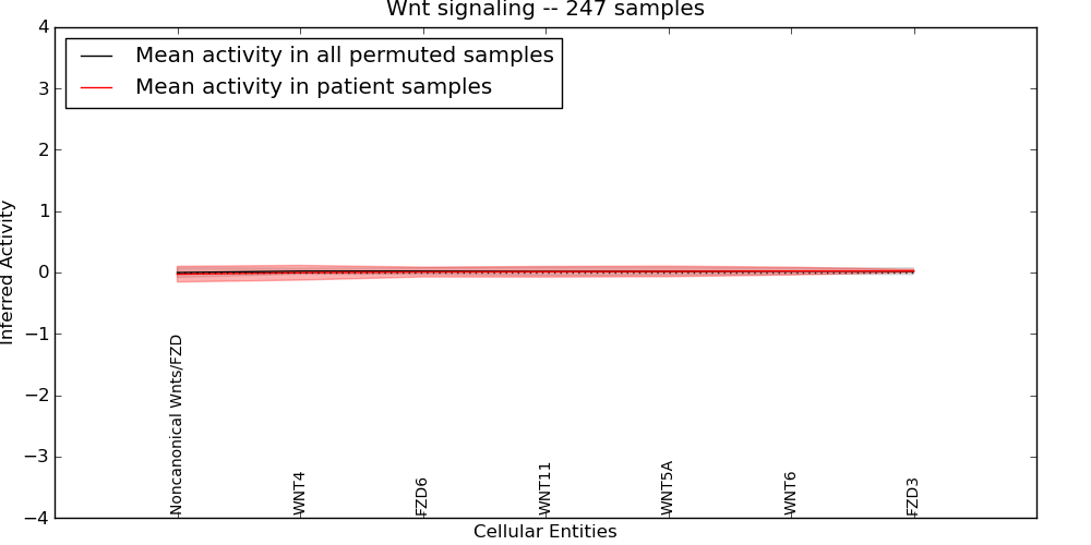 Figure S129. Get High-res Image This plot shows pathway concept perturbations across all samples against a permutation model. The concepts along the x-axis are sorted by lowest to highest mean activity for the real patient samples. Mean inferred activities are plotted along the y-axis as a colored band showing the average level and one standard deviation range. Real samples are shown in red and permuted samples in black.