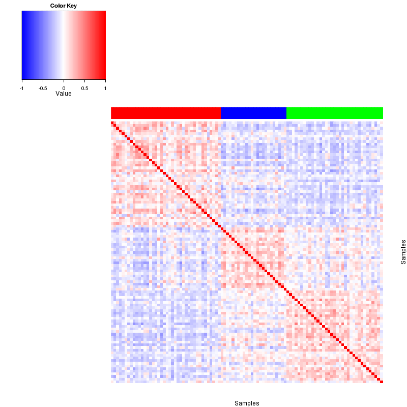 Figure 1. Get High-res Image Samples were separated into 3 clusters. Shown are 99 samples and 900 marker genes. The color bar of the row indicates the marker genes for the corresponding cluster.