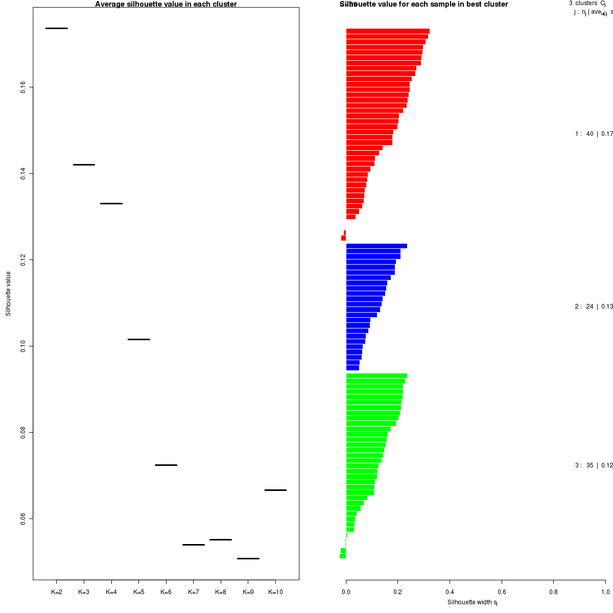 Figure 5. Get High-res Image The silhouette width was calculated for each sample and each value of k. The left panel shows the average silhouette width across all samples for each tested k (left panel). The right panels shows assignments of clusters to samples and the silhouette width of each sample for the most robust clustering.