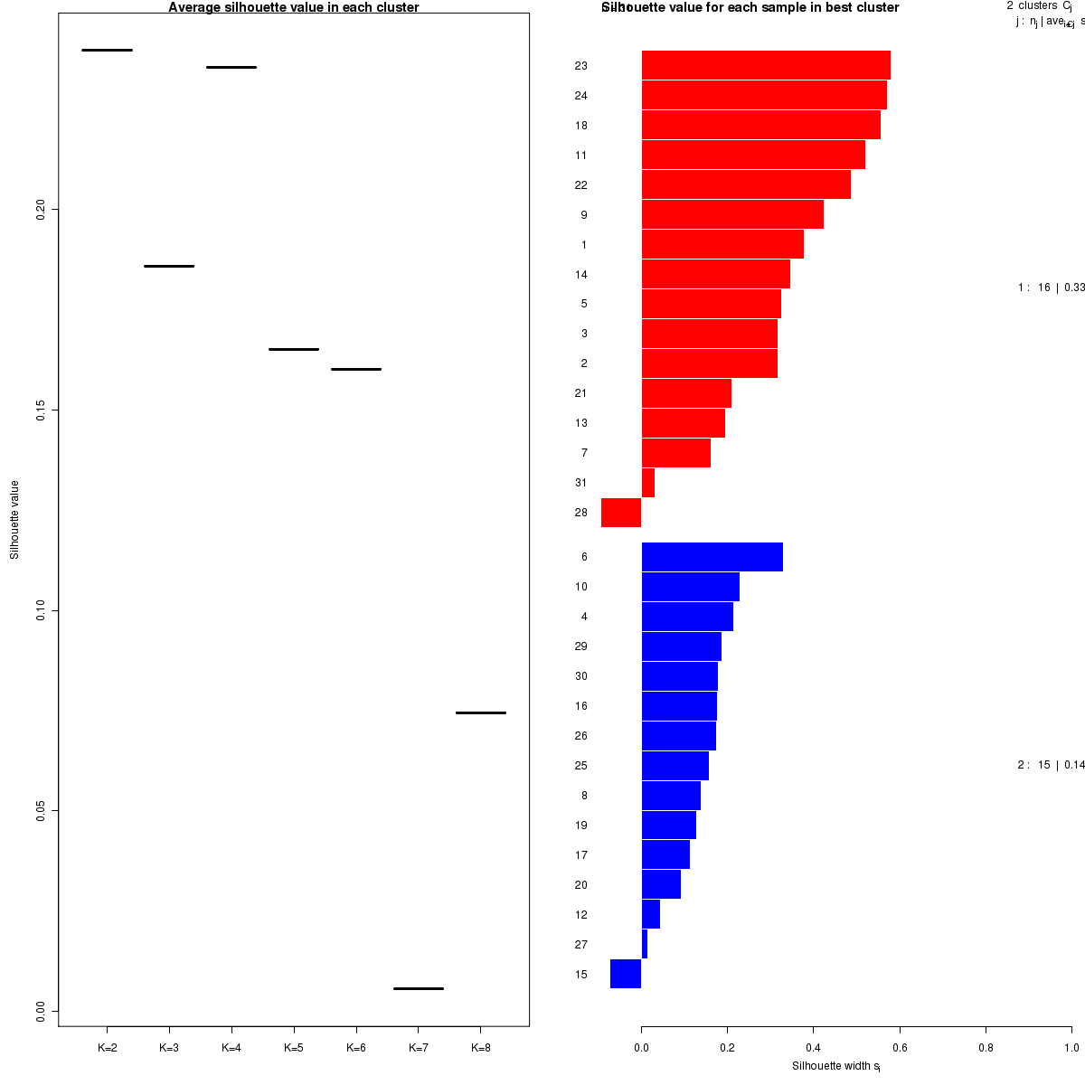 Figure 5. Get High-res Image The silhouette width was calculated for each sample and each value of k. The left panel shows the average silhouette width across all samples for each tested k (left panel). The right panels shows assignments of clusters to samples and the silhouette width of each sample for the most robust clustering.