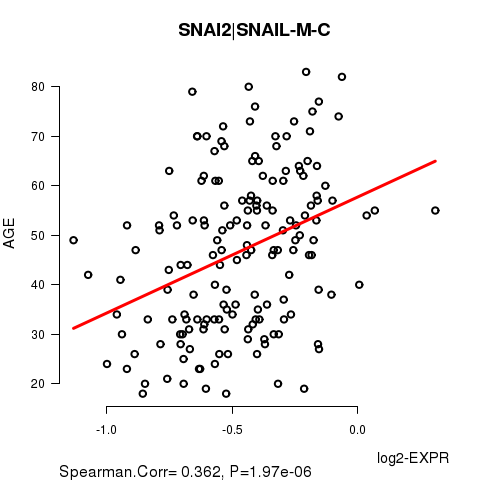 Figure S1. Get High-res Image As an example, this figure shows the association of SNAI2|SNAIL-M-C to 'AGE'. P value = 1.97e-06 with Spearman correlation analysis. The straight line presents the best linear regression.