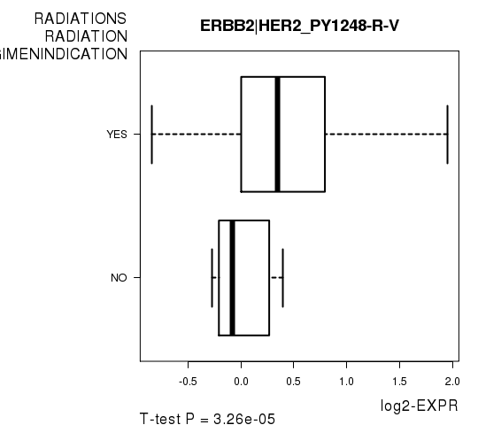 Figure S3. Get High-res Image As an example, this figure shows the association of ERBB2|HER2_PY1248-R-V to 'RADIATIONS.RADIATION.REGIMENINDICATION'. P value = 3.26e-05 with T-test analysis.