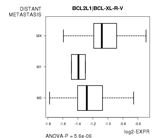 Figure S5. Get High-res Image As an example, this figure shows the association of BCL2L1|BCL-XL-R-V to 'DISTANT.METASTASIS'. P value = 5.6e-06 with ANOVA analysis.