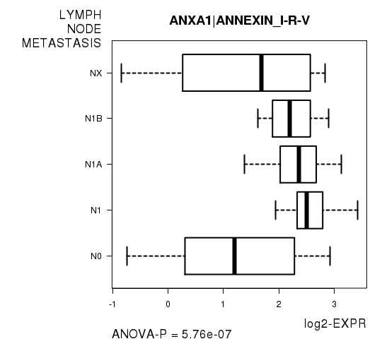 Figure S6. Get High-res Image As an example, this figure shows the association of ANXA1|ANNEXIN_I-R-V to 'LYMPH.NODE.METASTASIS'. P value = 5.76e-07 with ANOVA analysis.