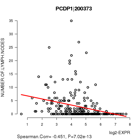 Figure S10. Get High-res Image As an example, this figure shows the association of PCDP1|200373 to 'NUMBER.OF.LYMPH.NODES'. P value = 7.02e-13 with Spearman correlation analysis. The straight line presents the best linear regression.