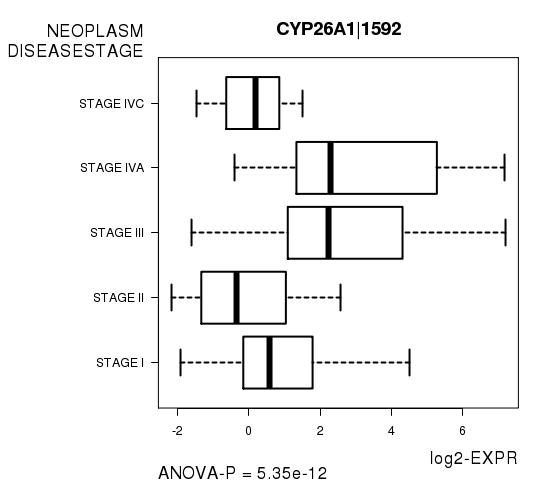 Figure S11. Get High-res Image As an example, this figure shows the association of CYP26A1|1592 to 'NEOPLASM.DISEASESTAGE'. P value = 5.35e-12 with ANOVA analysis.