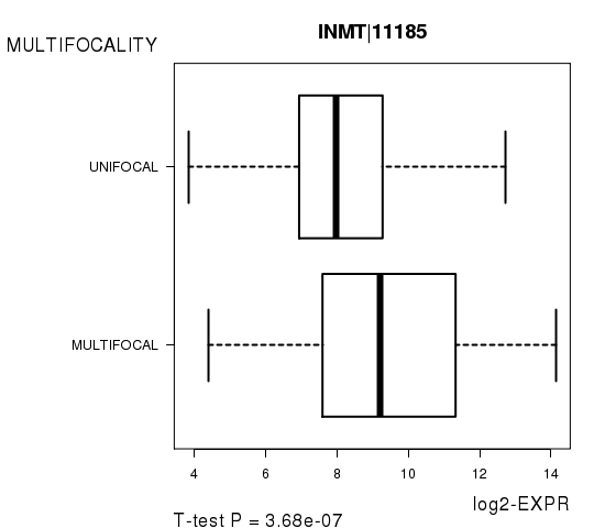 Figure S12. Get High-res Image As an example, this figure shows the association of INMT|11185 to 'MULTIFOCALITY'. P value = 3.68e-07 with T-test analysis.