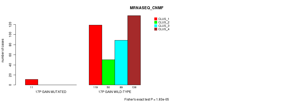 17p gain cnv correlated to 'CN_CNMF', 'METHLYATION_CNMF', 'MRNASEQ_CNMF', 'MRNASEQ_CHIERARCHICAL', 'MIRSEQ_CNMF', and 'MIRSEQ_CHIERARCHICAL'.