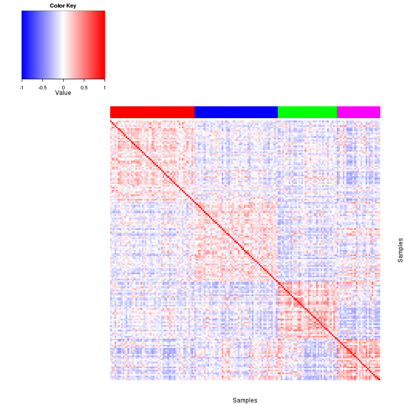 Figure 1. Get High-res Image Samples were separated into 4 clusters. Shown are 169 samples and 1200 marker genes. The color bar of the row indicates the marker genes for the corresponding cluster.